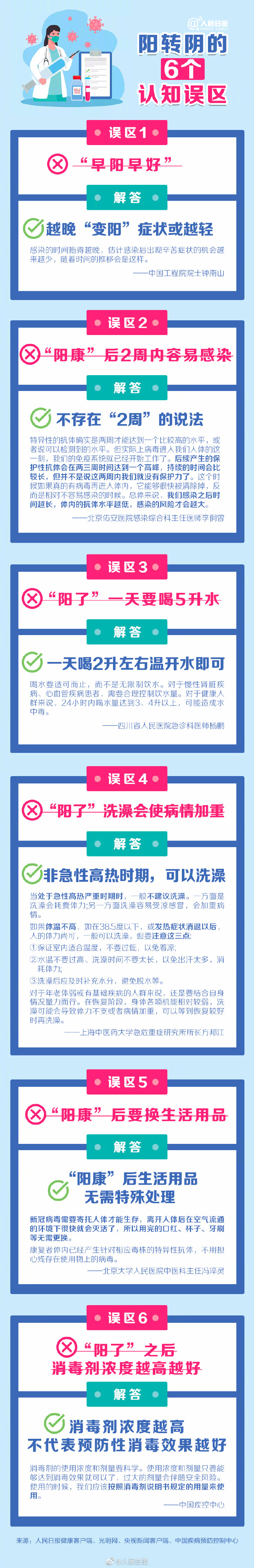 ①早陽早好?越晚變陽癥狀或越輕;②“陽康”后2周內(nèi)容易感染?不存在“2周”的說法;③“陽了”一天要喝5升水?一天喝2升左右溫開水即可;④“陽了”洗澡會(huì)使病情加重?非急性高熱時(shí)期可以洗澡。更多常見的認(rèn)知誤區(qū)↓↓