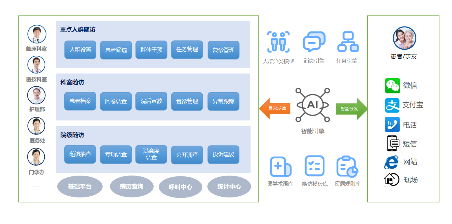 智能隨訪系統(tǒng)是運用互聯(lián)網(wǎng)、物聯(lián)網(wǎng)和人工智能等技術,將患者院內(nèi)外醫(yī)療服務與健康管理相結合,以診后隨訪、智能宣教、復診提醒、健康監(jiān)測、醫(yī)護患溝通等為患者管理主要手段,為不同類型醫(yī)療機構打造一站式的隨訪方案,為醫(yī)院提供院級隨訪、門診患者隨訪、住院患者隨訪、重點專案隨訪等符合不同應用場景的隨訪方案。