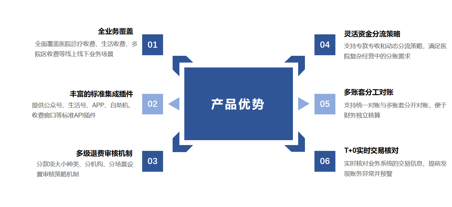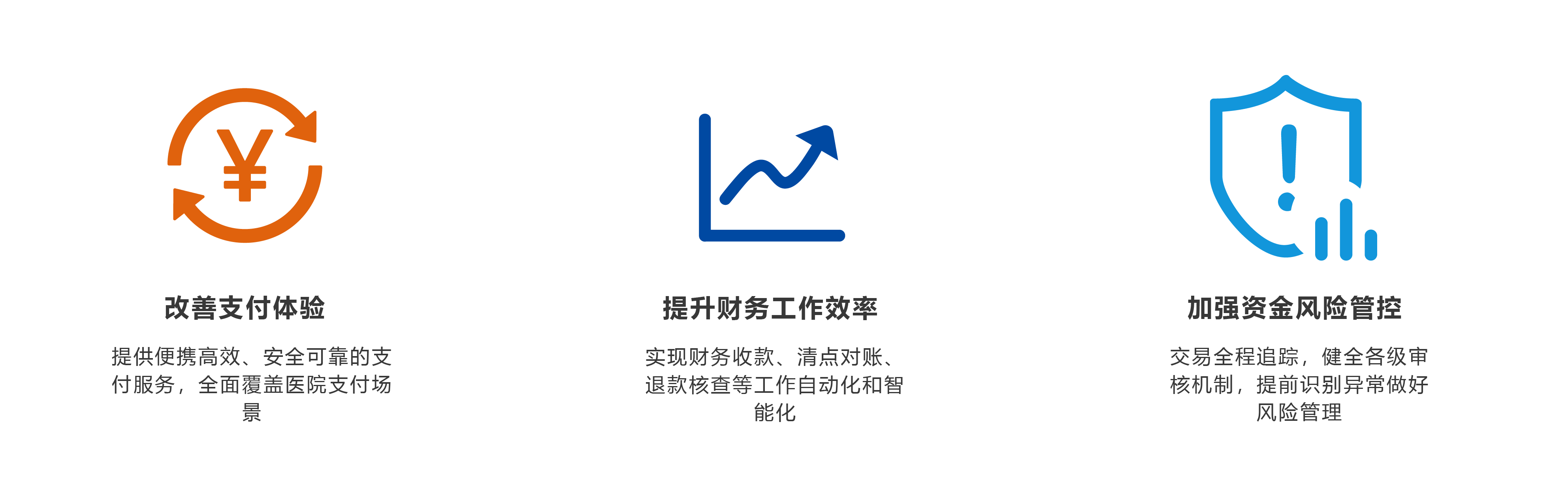 通過提供便捷高效、安全可靠的支付服務(wù),全面覆蓋醫(yī)院支付場景,有效提高財務(wù)工作效率,加強資金風險管控。